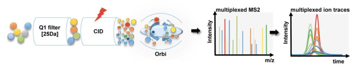 数据非依赖性的扫描模式(Data-independent acquisition, DIA)是近几年来发展的一种新的质谱数据采集方式。可以对特定质量范围内的所有母离子进行碎裂,采集所有母离子的碎片离子信息进行蛋白定性和定量。目前流行的蛋白质组学研究手段,如iTRAQ\TMT、 Label-free、SILAC采用的都是数据依赖性的扫描模式(Data-dependent acquisition, DDA)。相对于DDA, DIA 具有更好的准确性和可重复性,是蛋白质组学研究的一大重要趋势。下图为 DIA 定量技术原理图: