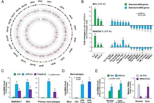 本研究中,研究人员报道lincRNA-Cox2位于1号染色体上PG-内过氧化物合酶2(Ptgs2/ Cox2)基因的近端,是小鼠巨噬细胞中受NF-κB信号控制的早期炎症基因。在功能上,lincRNACox2是在细菌LPS刺激下,受NF-κB调节的晚期炎症反应基因转录所必需的。具体地,lincRNA-Cox2在LPS刺激后,在细胞中被组装进SWI/SNF复合物中。这会导致lincRNA-Cox2/SWI/SNF复合物可以调节NF-κB亚基组装到SWI/SNF复合物中,最终,调节巨噬细胞中SWI/SNF相关的染色质重塑和晚期炎性应答的基因的 反式激活,以应对微生物的挑战。