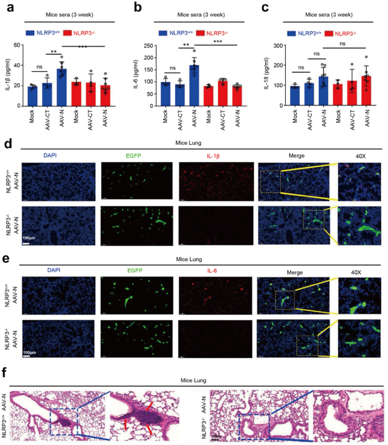 ELISA结果显示,AAVlung-N诱导NLRP3+/+小鼠IL-1β和IL-6的表达,在NLRP3-/-无明显影响,说明NLRP3在N蛋白介导的IL-1β和IL-6激活中不可或缺(Fig.9a&9b),对IL-18激活没有影响(Fig.9c)。并且携带AAVlung-N的NLRP3+/+小鼠肺组织免疫组化结果IL-1β和IL-6的表达明显高于NLRP3-/-小鼠(Fig.9d&9e)。HE病理染色同样显示携带AAVlung-N的NLRP3+/+小鼠肺部有明显的炎症病变及组织损伤(Fig.9f)。因此,N蛋白通过激活NLRP3炎症小体诱导小鼠全身炎症,引发肺损伤。