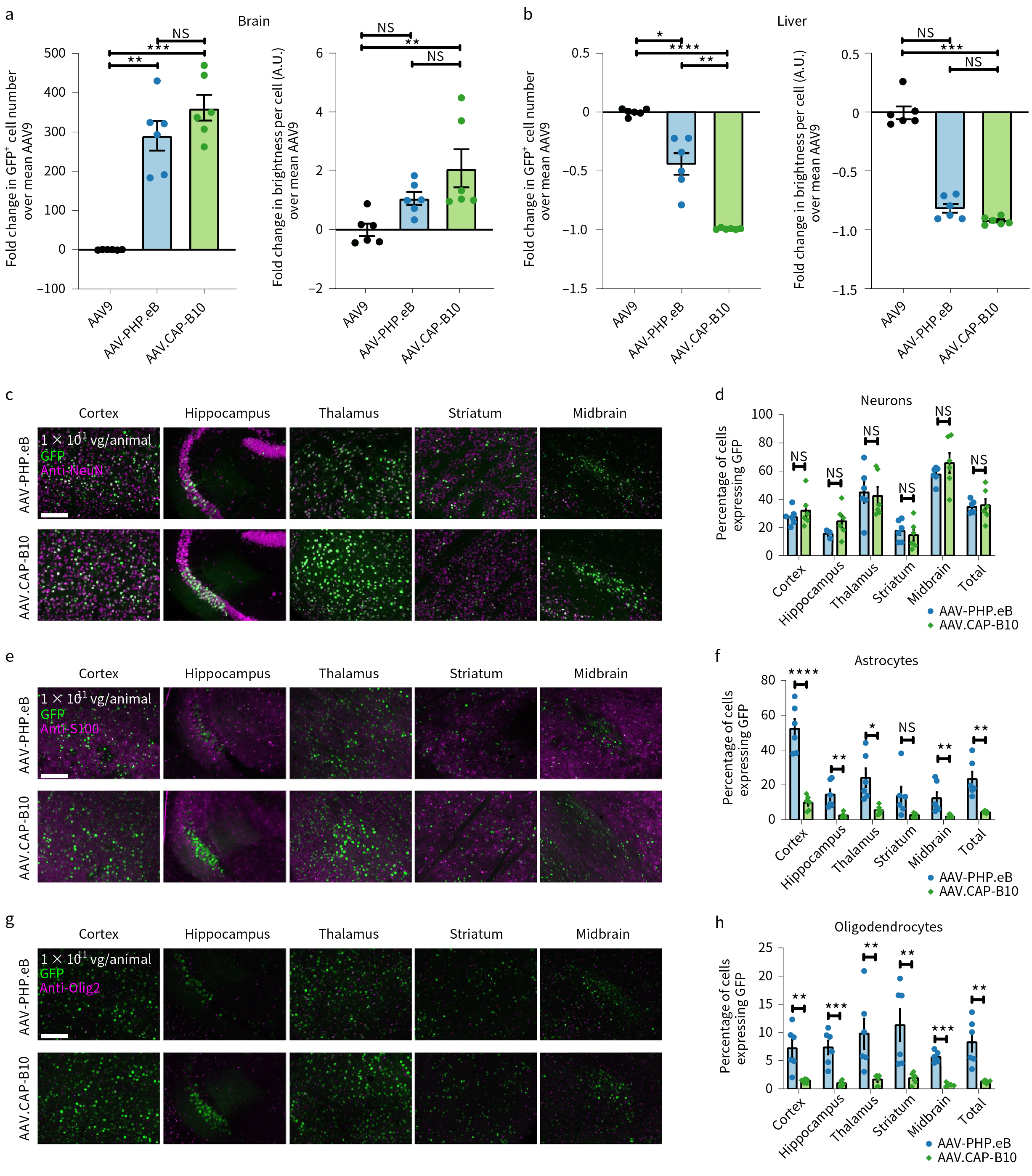 而全新的AAV.CAP-B10血清型病毒,通过静脉注射,对中枢神经系统具有高度特异性,靶向神经元。该研究团队对比了三种不同的AAV血清型通过静脉注射在各组织器官中的递送效率(pAAV-CAG-NLS-GFP,1x1011vg,3周切片),结果发现,AAV.CAP-B10表现出对中枢神经系统具有高度特异性和肝脏的低靶向性;同时,脊髓中,AAV.CAP-B10的递送效率比AAV-PHP.eB弱约40%,但比AAV9高约16倍。