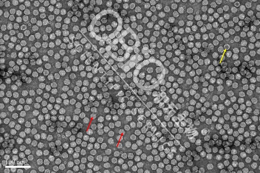 电镜结果:包装DNA基因组的病毒颗粒为实心颗粒(红色箭头);空病毒颗粒中间存在空洞(黄色箭头)