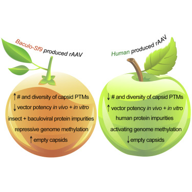尽管在过去的10年里,监管部门陆续批准若干基于AAV的基因治疗产品,但该领域仍面临多项挑战,例如rAAV的产量、质量、免疫原性等。2020年9月,Neil G. Rumachik等人在Mol Ther Methods Clin Dev.发表的工作就对293细胞与Sf9细胞的rAAV生产系统差异做了分析。该工作发现,差异主要集中在生产过程中产生的杂质、衣壳蛋白翻译后修饰(post-translational modifications, PTMs)和体内/体外的感染效率(图2)