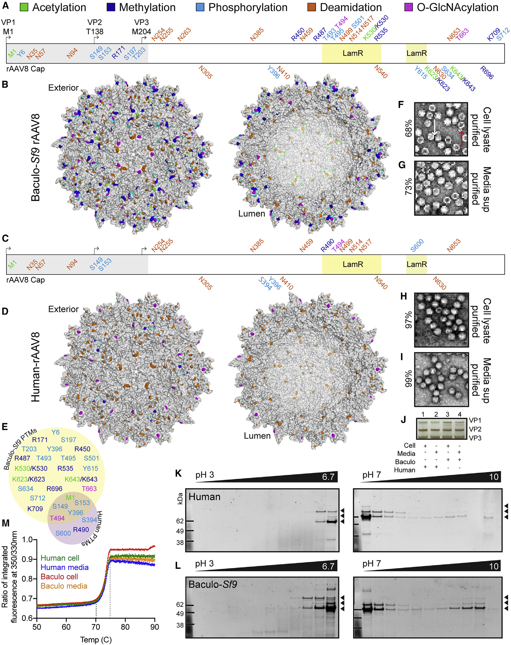 1)不同的包装系统生产的rAAV病毒颗粒衣壳具有不同的PTMs,包括糖基化、乙酰化、磷酸化和甲基化(图3);