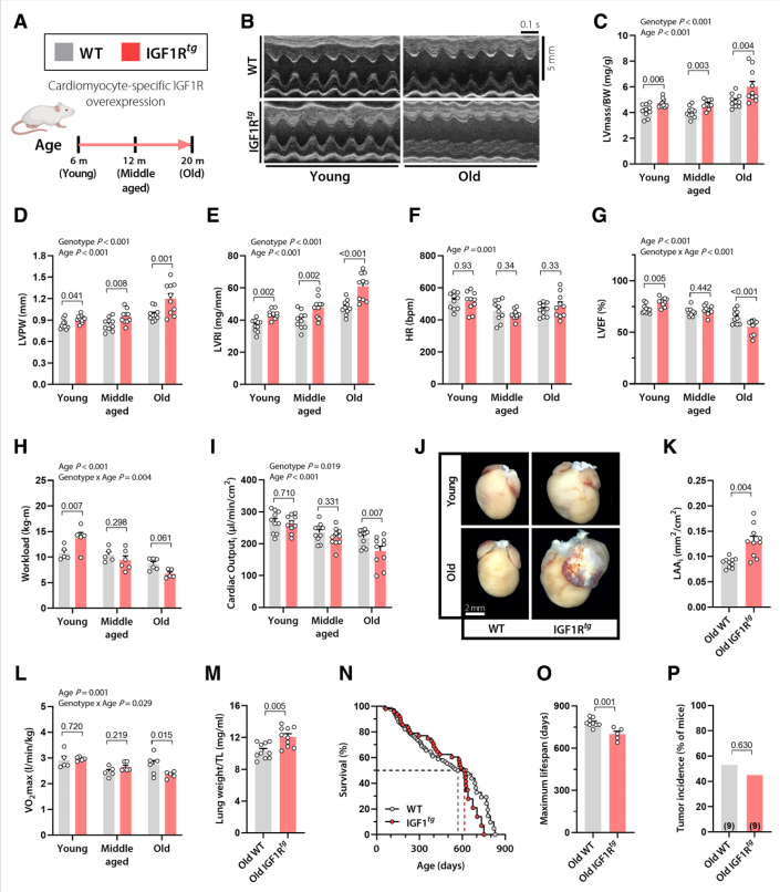小鼠心肌细胞IGF1R过表达导致早期优越的心脏功能及生理性肥厚,但会加速心脏衰老及心力衰竭最终减少晚年寿命