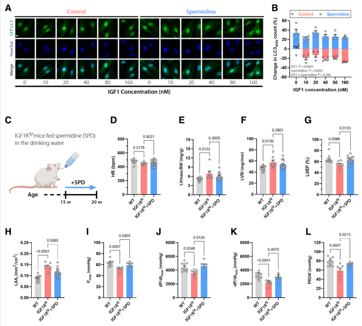 为了充分证明老年Tg小鼠自噬失调和心功能受损之间的因果关系,研究者给小鼠补充亚精胺,之前已经证明亚精胺可以增强老年小鼠的心脏自噬。实验证实亚精胺能有效阻止IGF1诱导的心肌细胞系自噬抑制。经过5个月的亚精胺喂养后对Tg小鼠心脏进行评估,发现亚精胺喂养的Tg小鼠的心率、LV质量和重构指数与未处理Tg小鼠基本相同。虽然亚精胺不能逆转已建立的心肌肥厚,但它也能改善左室射血、重构及最大最小压等。补充亚精胺至少在一定程度上改善了衰老Tg小鼠的三羧酸循环和糖酵解中间体的水平。以上这些结果提示,心脏自噬减少可能参与了老年Tg小鼠心功能障碍加重的过程。