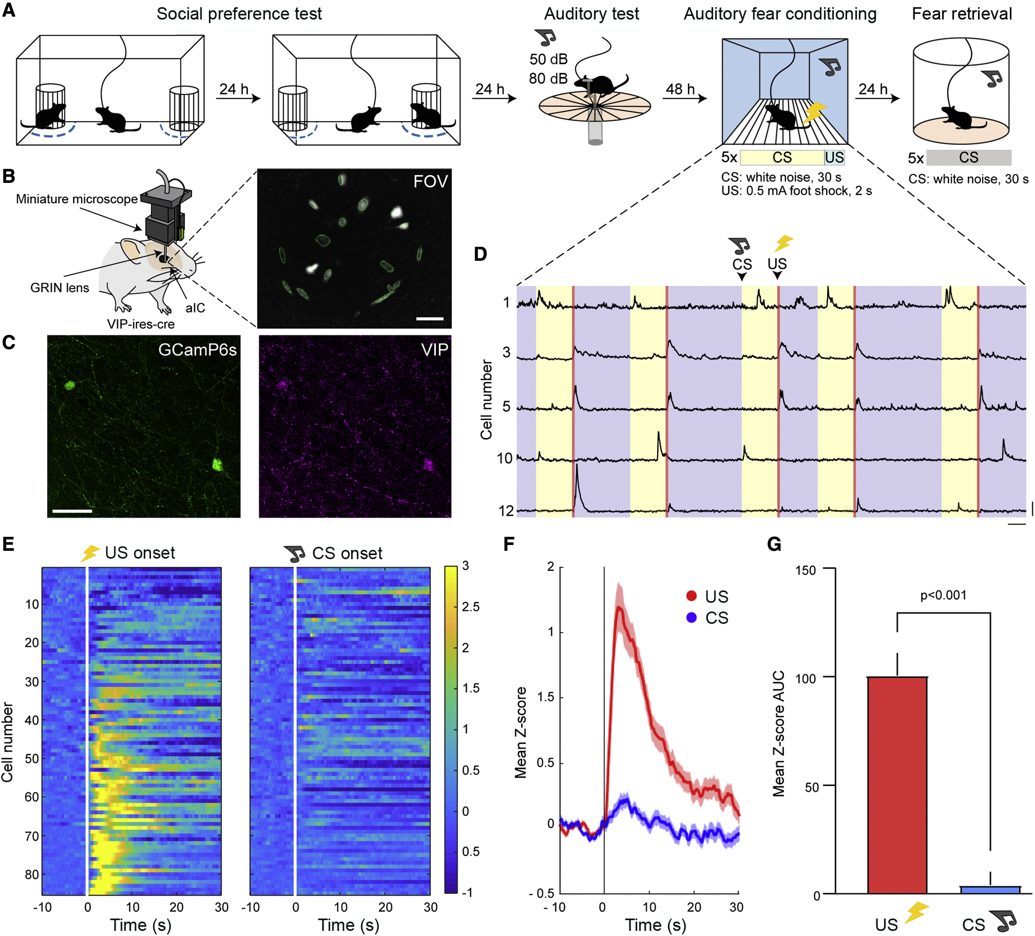 接下来来到记录部分。本文中作者使用了目前相当先进的微显微镜植入技术结合钙离子成像,对aIC中的VIP+INs进行单细胞水平的记录(图 3B-3C)。为了检测VIP+INs在适应性行为中的活动规律,作者设计了一套为期5天,由3种不同行为结合起来的组合范式(图3 A)。三个行为范式从时间顺序上分别为社交偏好,声音刺激,以及恐惧记忆(建立和提取)。