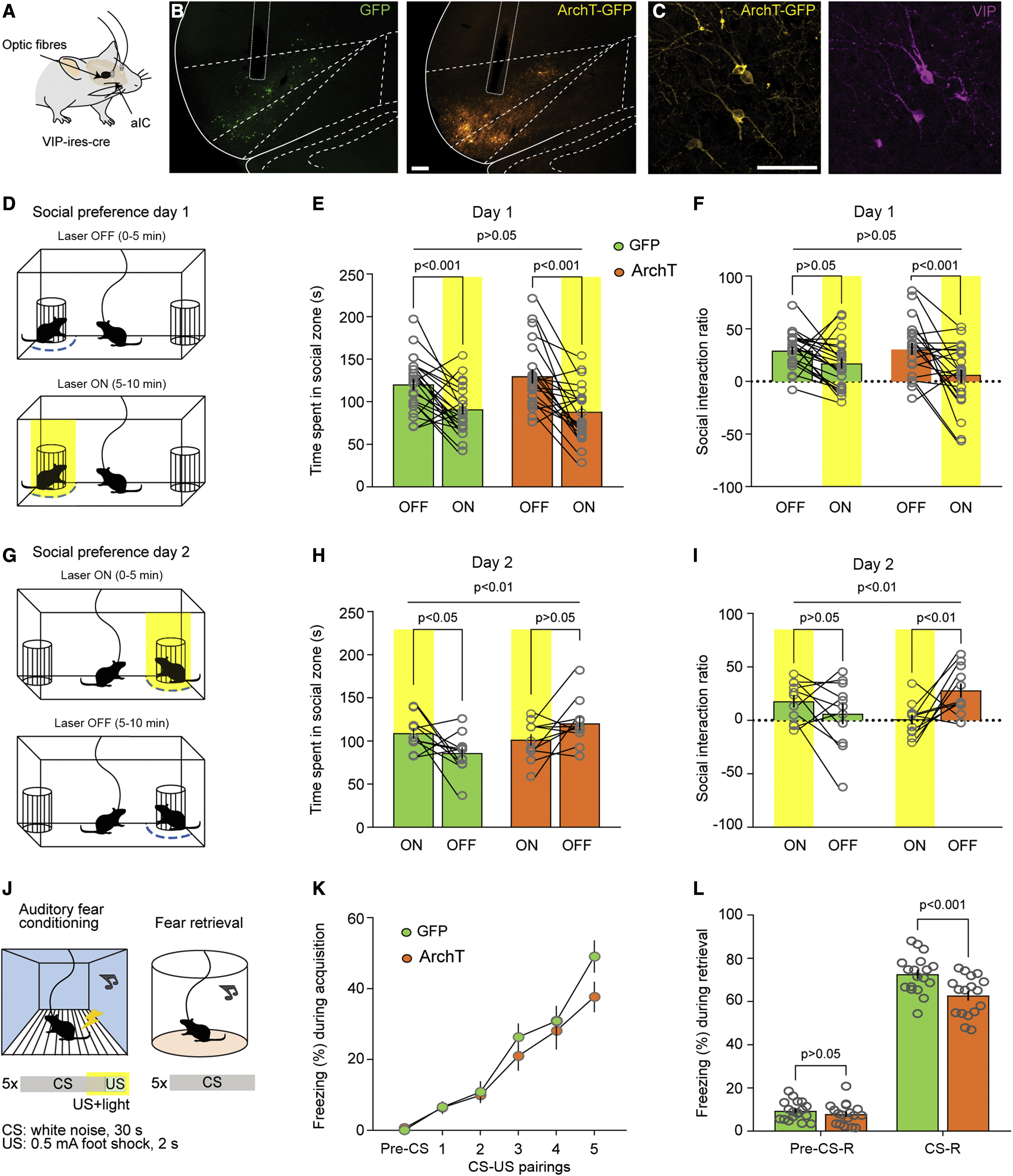 经过了示踪-记录之后,最后到了三部曲的结尾即操纵。作者将抑制性光蛋白ArchT表达在aIC的VIP+INs中从而可以利用光照抑制VIP+INs的活动。在社交范式中,光刺激可以改变动物的社交偏好(图 5E-5I);而在恐惧记忆范式中光刺激可以破坏条件性刺激和非条件性刺激的偶联(图 5K、5L)。