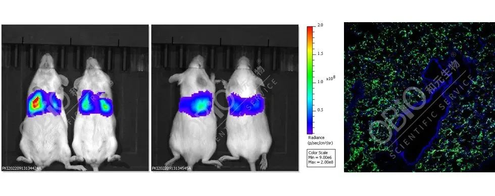 AAV-LungX尾静脉注射肺脏转导(5E+11vg/只,左:小动物活体成像结果;右:荧光结果)