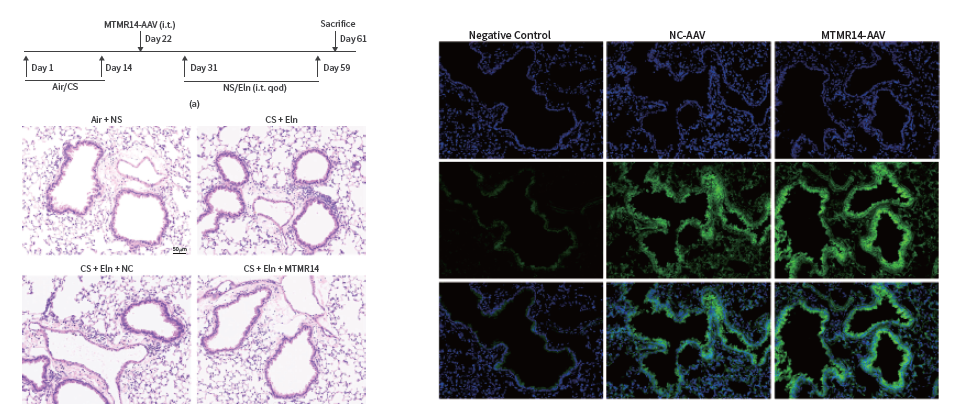 慢性阻塞性肺疾病(Chronic obstructive pulmonary disease ,COPD)是一种慢性炎症性疾病,已成为全球第四大常见死因。2022年华中科技大学同济医学院谢俊刚教授团队在Oxidative Medicine and Cellular Longevity杂志发表的工作中,借助rAAV载体介导MTMR14在COPD小鼠肺部过表达,并进一步验证发现MTMR14过表达可以抑制小鼠COPD的进展。