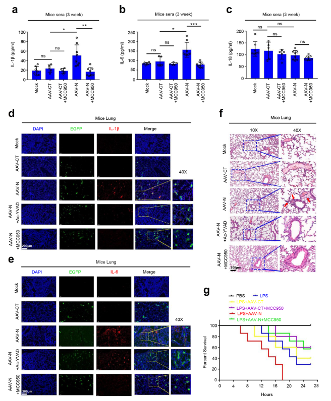 2019冠状病毒病(COVID-19)是一种由严重急性呼吸道综合征冠状病毒2型(SARS-CoV-2)引发的传染病,是一场全球性公共卫生危机。SARS-CoV-2的核衣壳蛋白(Nucleocapsid,N蛋白)在病毒生命周期的多个步骤中发挥关键作用。2021年8月,Nature Communications杂志刊登了暨南大学吴建国教授团队的工作,该研究揭示了SARS-CoV-2 N蛋白通过NLRP3炎症小体诱导肺损伤的新机制。文中,研究团队借助AAVlung经尾静脉注射在小鼠肺部高表达N蛋白(AAVlung-N)发现过表达N蛋白后,可显著增加IL-1β,IL-6,TNF,CXLC10,CCL2等炎症因子的表达,且肺部有明显的炎症病变及组织损伤。