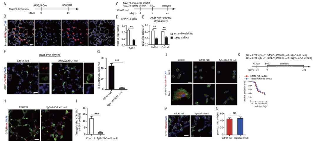 特发性肺纤维化(Idiopathic Pulmonary Fibrosis, IPF)是一种常见的肺泡疾病,被称作“不是癌症的癌症”。2019年12月,北京生命科学研究所/清华大学生物医学交叉研究院汤楠实验室在Cell杂志上发表研究论文。文中,作者借助了病毒载体介导的基因表达调控策略,通过气管内插管的方式将rAAV2/9-Tgfb1 shRNA注射到PNX处理的Cdc42缺失小鼠的肺部,以下调的Tgfb1表达,并配合多种实验手段发现,AT2细胞中激活的TGF-b信号对于机械性张力驱动的肺纤维化的进展至关重要。