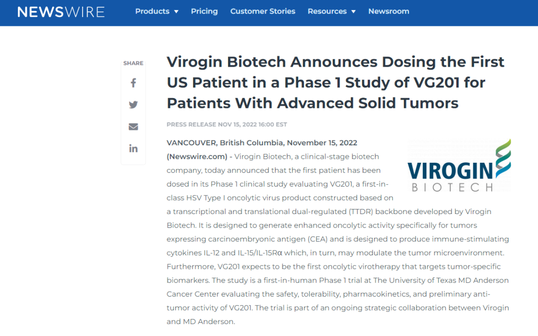 【客户动态】复诺健生物与德克萨斯大学MD Anderson癌症中心完成VG201美国Ⅰ期临床首位实体瘤患者给药
