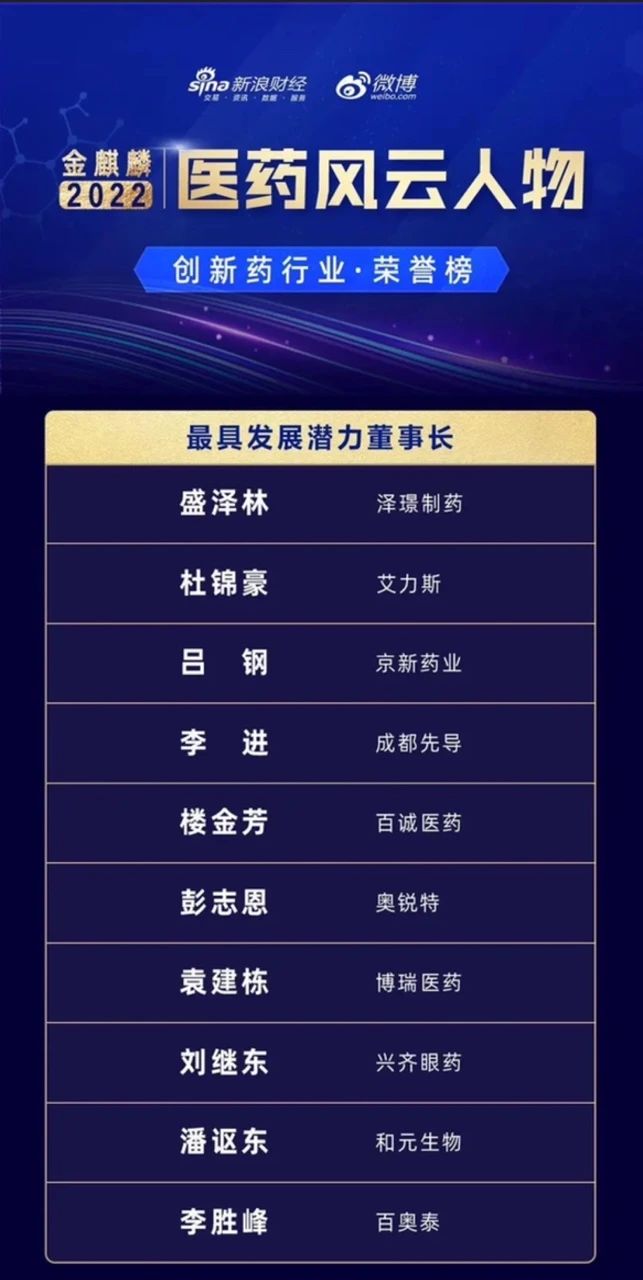 2022中国创新药行业风云人物评选榜单揭晓 至尊国际·(中国)至尊服务,至尊享受 董事长潘讴东当选“最具发展潜力董事长”