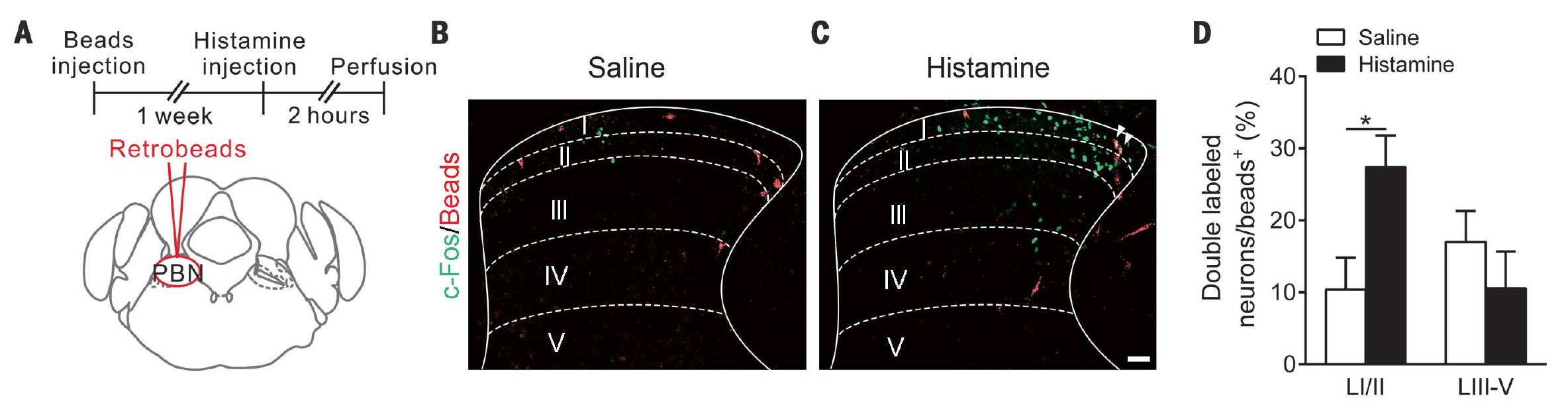 作者首先使用Retrobeads逆向标记了脊髓-臂旁核的投射,同时给予小鼠痒刺激(组胺),结果发现在痒刺激给出后,脊髓背侧神经元的c-Fos表达量明显上升,且c-Fos表达上升的神经元与逆向标记的脊髓-臂旁核投射发生一定程度的重合(图1)。c-Fos代表了神经元的活动,表明脊髓-臂旁核投射确实参与了痒信息的处理。