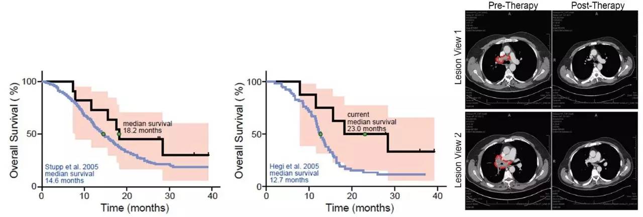 可喜的是今年4月10日Cancer cell上发表的一项临床试验,证明给予脑癌和肺癌病人注射800~1000倍的维生素C是安全的,并且可以改变细胞内的Fe代谢,诱导活性氧的产生,致使癌细胞内特异性的DNA损伤引起癌细胞死亡,达到有效治疗癌症的作用[2]。治疗后患者的生产期明显延长,肿瘤明显变小(见下图)。