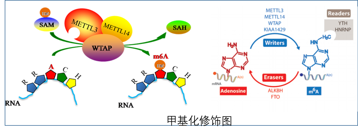 N6-甲基腺嘌呤(N6-methyl-adenosine(m6A))是高等生物中含量最为丰富的一种RNA甲基化形式,平均每一条mRNA含有3-5个,存在于保守序列RRACH(R=G ,A; H=A,C or U)的腺嘌呤上。其功能由“编码器”(Writer)、“读码器”(Reader)及“消码器”(Eraser)协同起作用。编码器(Writer)即甲基转移酶METTL3、METTL14等,消码器(Eraser)可逆转甲基化有FTO、ALKBH等,m6A由m6A结合蛋白(读码器(Reader))识别,目前发现的有YTH等结构域蛋白。