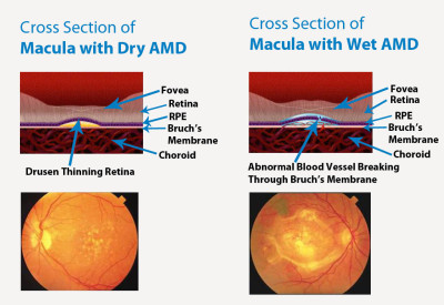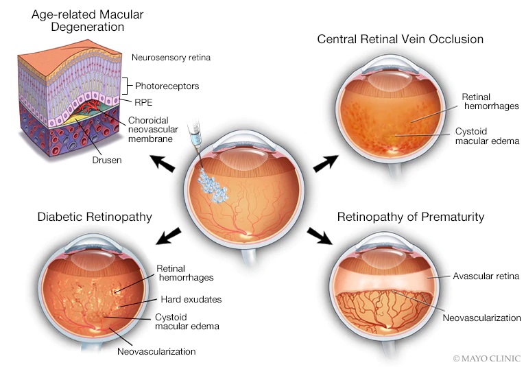 wet AMD也被称为新生血管性或渗出性老年黄斑变性,患者眼内随着脉络膜新生的异常血管增生并穿过视网膜色素上皮,由于新生血管较脆弱,易破裂出血或血液成分漏出,导致视网膜脱离、黄斑水肿,并引起视物变形或形成盲点,进而视力明显下降,势力迅速丧失。因此,针对wet AMD的疗法主要包括靶向VEGF(血管内皮生长因子)的眼内注射药物(例如再生元的Eylea和罗氏的Avastin),通过药物抑制眼内血管生长,改善 wet AMD患者视力。