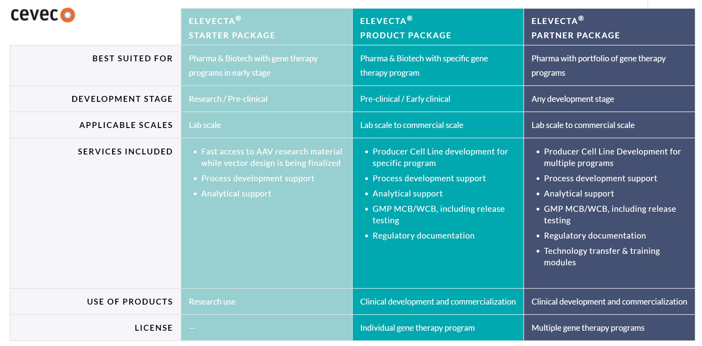 CEVEC公司专注于为客户提供用于先进生物治疗的高性能细胞生产技术,他们从研究水平到工业化生产水平提供全方位细胞技术服务,此次发布的ELEVECTA是大规模AAV生产的专利技术。目前,CEVEC是市场上第一家也是唯一一家提供基于稳定生产细胞株的AAV载体生产技术的供应商。