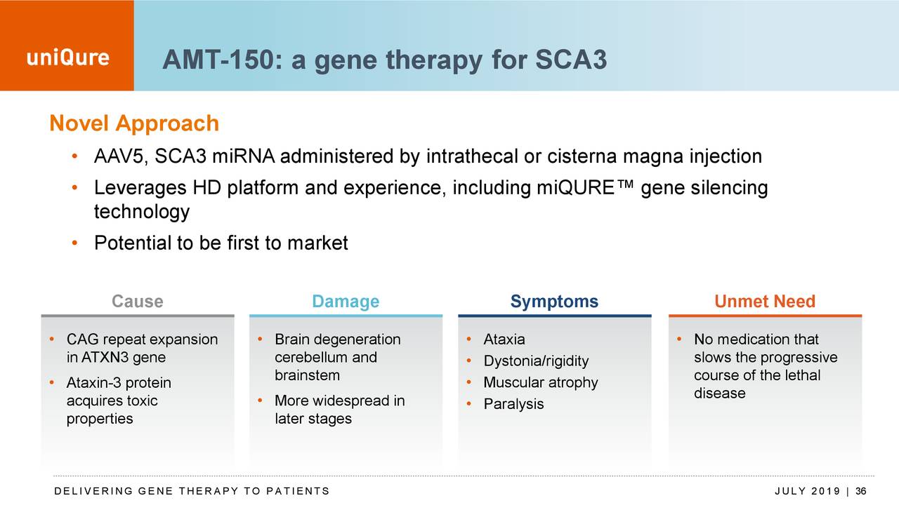 SCA3,也被称为Machado-Joseph病,是由ATXN3基因的CAG序列重复扩增引起的,发生该基因突变会导致ataxin-3蛋白发生异常。患有SCA3的人会经历脑的退化,机体上显示运动障碍、强直、肌肉萎缩和瘫痪,目前还没有有效的治疗方法来减缓这种致命疾病的发展。UniQure的AMT-150疗法是一种一次性的、脑池给药的AAV基因疗法,该疗法结合该公司专有的miQURE™基因沉默技术,在脑内阻止早期SCA3患者运动失调。AMT-150目前正处于临床试验前新药研发阶段。