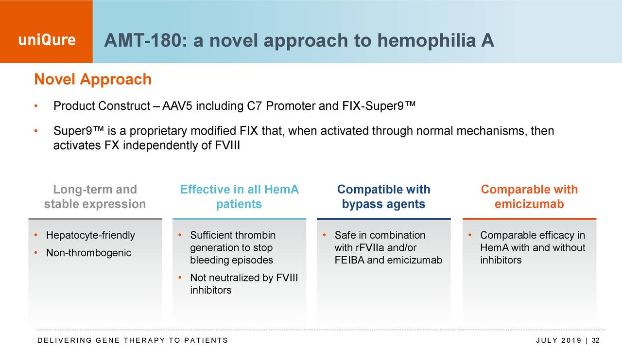 来自啮齿动物和NHPs的多个体内研究数据表明,单次输注AMT-180在动物体内的耐受良好,且没有增加凝血激活的标志物表达。UniQure正根据临床前研究的数据评估凝血因子VIII缺乏的凝血活性,并将其与FIX-FIAV蛋白水平相关联,预测合适的临床药物使用剂量。