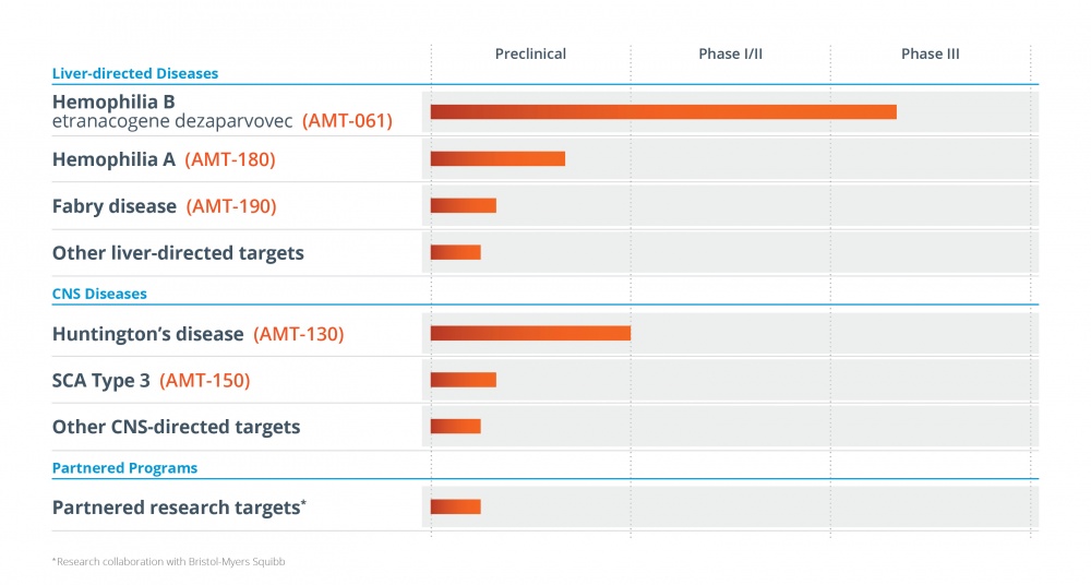 uniQure公司的愿景是提供治疗性基因疗法改善患者的生活,他们致力于研发基因疗法用于治疗各种因基因缺陷和异常引起的疾病,如血友病、Huntington Disease、SCA3等,目前在多个疾病领域都有自己的开发计划。通过与领先的学术机构和研究机构合作,uniQure赞助多种临床前和早期临床试验的候选基因治疗产品,使得他们的成本效益增大,同时没有耗费大量资源。此外,uniQure创新且模块化的技术平台能最大程度保证产品安全性和有效性。
