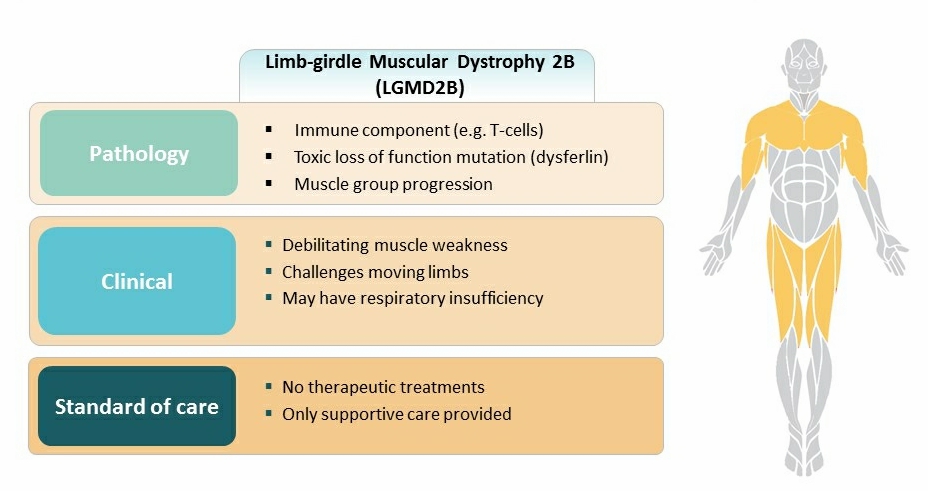 LGMD是一种常见肌营养不良症,该疾病带来的是肩膀和上臂肌肉以及中央臀部肌肉的肌营养不良。LGMD可以出现在儿童早期和中年晚期,通常进展非常缓慢。与LGMD相关的肌肉退化会导致摇晃步态和难以到达头顶,晚期心脏和呼吸肌也可能受到影响,是一种致命性疾病。