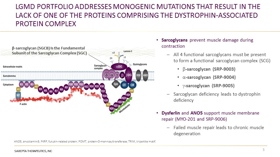 SRP-9003(原MYO-101和scAAVrh74.MHCK7.hSGCB)是治疗肢体束带型肌营养不良(LGMD) 2E型的候选基因治疗疗法。2E型LGMD(LGMD2E)是一种由SGCB基因突变引起的肌营养不良症,SGCB基因的作用是生成β-sarcoglycan蛋白,β-sarcoglycan是一种更大的蛋白质sarcoglycan protein complex的一部分,这种蛋白质对肌肉组织的健康至关重要,因而LGMD患者的肌组织缺乏β-sarcoglycan。SRP-9003借助scAAVrh74和MHCK7启动子,向骨骼、心脏和横膈膜肌肉传递人类SGCB基因的功能性副本,来恢复肌肉组织中的β-sarcoglycan水平。