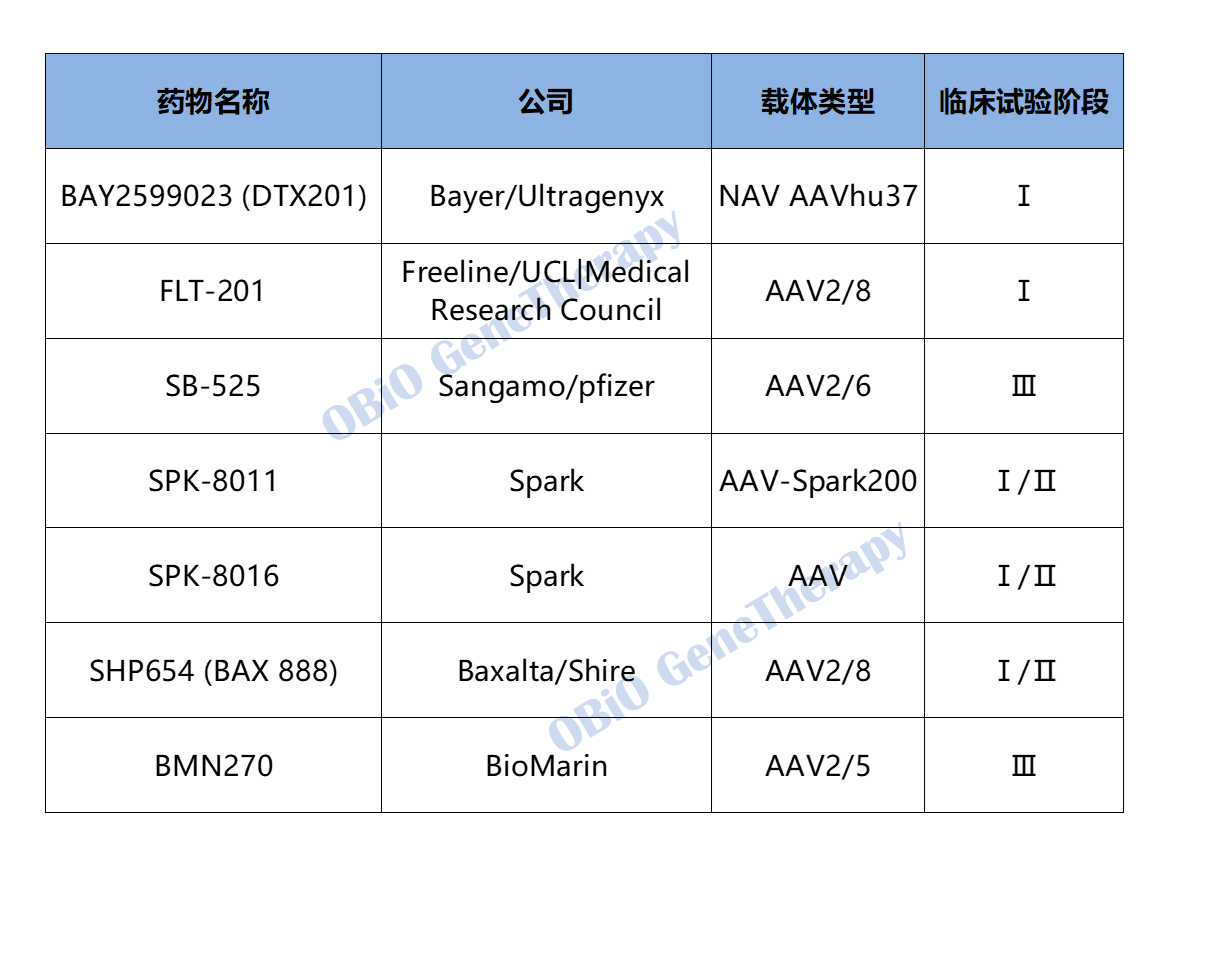 SHP654是由Shire公司/Baxalta公司共同开发的基因疗法,她利用腺相关病毒血清型8(AAV2/8)载体,将一种经过密码子优化的、B结构域删除的凝血因子VIII(BDD-FVIII)专门递送至患者肝脏,之后在肝脏细胞中表达出凝血因子VIII并用于控制出血。该公司在2017年底启动一项I/II期临床研究,评估SHP654的安全性以及用于提高凝血因子VIII活性水平并影响血友病出血的最佳给药剂量。