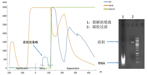 凝胶过滤层析的目的是去除大量RNA残留。高浓度硫酸铵(≥1.5 M硫酸铵)的平衡液使RNA和质粒的空间大小的差异性达到了最大,质粒通过层析柱的外水体积首先流出。组群分离(Group separation)模式使其上样体积达到了0.3CV。本步层析以后,质粒已经达到了很高的纯度,琼脂糖凝胶电泳几乎看不到RNA杂带,见如下电泳图所示。