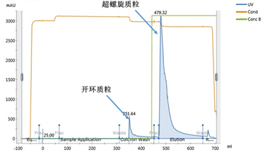 亲和层析的主要目的是去除开环质粒。凝胶过滤得到的质粒被置换到高浓度硫酸铵的缓冲液,可以直接上样至亲和层析柱,在此条件下,开环和超螺旋质粒均与填料结合;上样结束后,首先用2.0 M硫酸铵的缓冲液冲洗开环质粒;然后用含1.7 M硫酸铵和0.3 M氯化钠的缓冲液将超螺旋质粒洗脱,实现开环质粒与超螺旋质粒的分离。