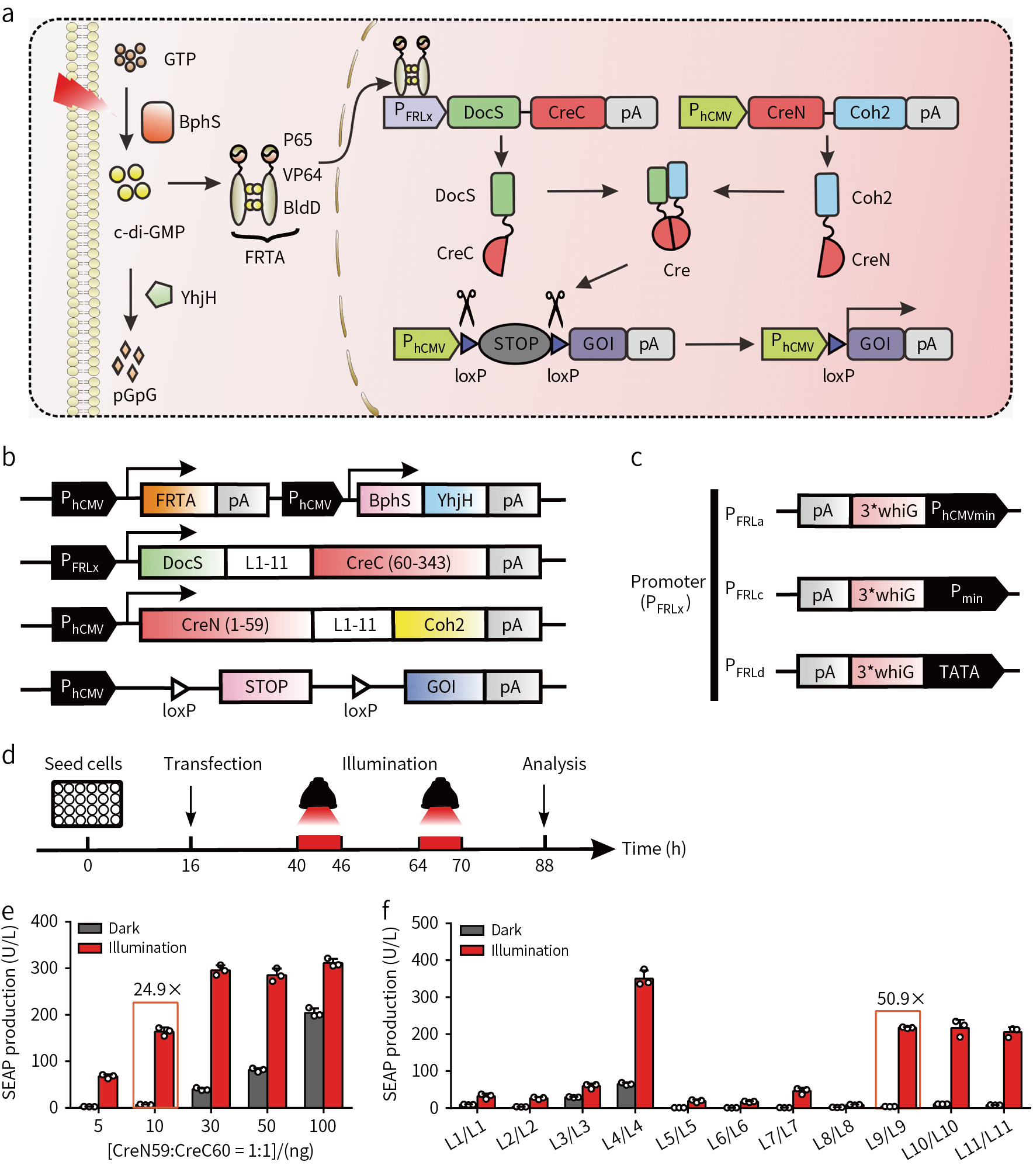 基于对Cre酶的结构分析,将Cre酶CreN59/CreC60分离,构建FISC系统(图1a)。在FRL光照条件下,DocS-CreC60融合表达与Coh2-CreN59结合,Cre酶2个片段重新组合,可以切除2个loxP位点间的DNA序列(图1b)。为了降低背景的影响,提高DNA重组效率构建了3个FRL应答的启动子PFRLx(图1c),并对不同启动子的启动效果进行比较,结果发现在TATA启动子的控制条件下,DocS-CreC60的光诱导重组效率更好(图1d);4个质粒比列为10:1:1:20时共转染HEK293细胞时,FRL诱导的DNA重组效率最高(图1e);L9/L9链接方式在FRL诱导时DNA重组效率最高(图1f)。