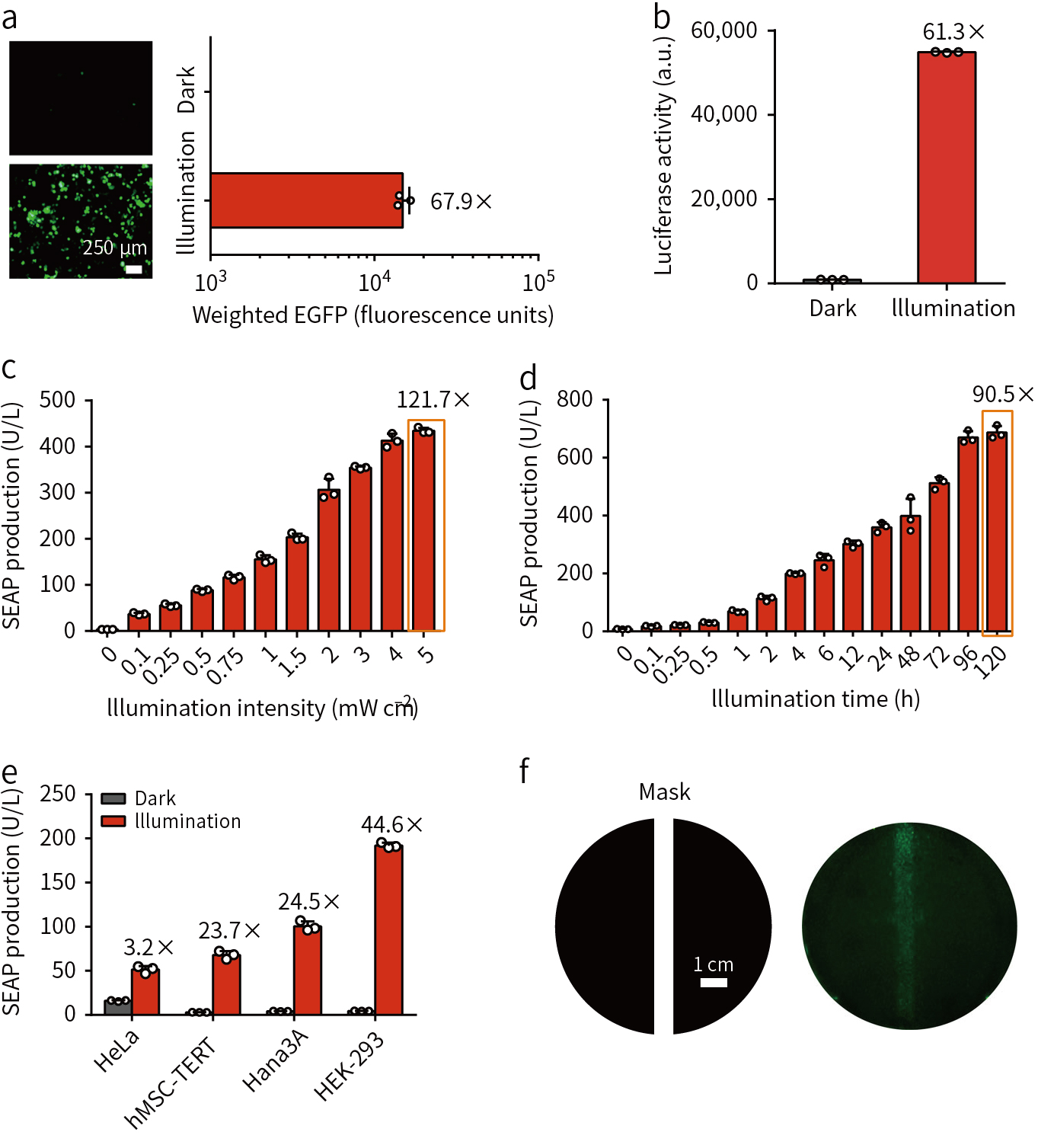 为了证明在哺乳动物细胞中对Cre酶活性的作用,在HEK-293细胞转染FISC质粒和带有loxP位点的绿色荧光蛋白(EGFP)或荧光素报告酶(Luciferase reporter)基因,结果表明,具有FISC的细胞在FRL作用下发生重组,无FRL时基因重组水平极低(图2a, b),且DNA重组的效率与FRL光照强度和光照时间呈现正相关关系(图2c, d)。除了HEK-293细胞外,FISC也可以激活其他细胞的基因重组(图2e),利用光掩膜控制FRL照射的空间区域(图2f),证明了该系统的高空间分辨性。FISC系统中,FRL没有明显的细胞毒性且具有更高效的DNA重组。