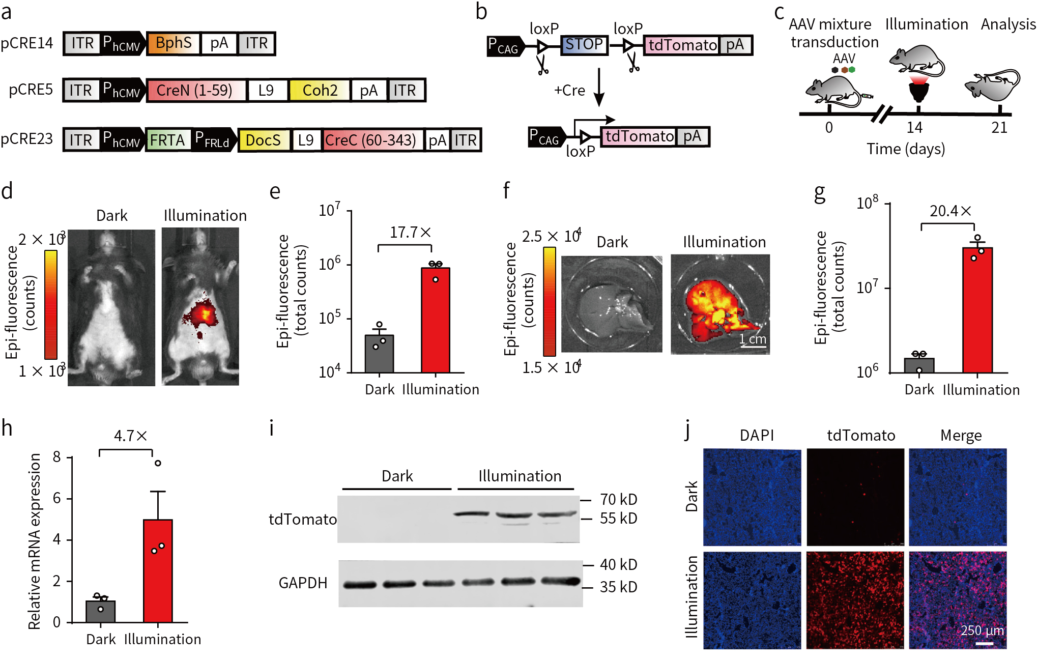 AAV载体作为生物研究和临床治疗的首选病毒载体,具有较低的免疫原性和致癌风险。为了使该系统在未来的疾病治疗中具有更为广阔的应用前景,因此研究人员通过AAV载体将FISC系统导入tdTomato小鼠。由于AAV载体的容量限制,所以将FISC系统重新设计3个AAV病毒载体(图4a)。将3个病毒载体混合通过尾静脉注射到小鼠体内(图4b, c),3周后荧光成像显示暴露于FRL下的小鼠比未暴露于FRL下的小鼠基因转导效率增加17.7倍(图4d, e),并且检测发现肝脏中信号最强(图4f, g),对肝脏组织进行qRT-PCR和WB分析(图4h, i),AAV载体介导的FISC系统在FRL照射条件下基因表达水平和蛋白表达水平均显著增高,肝脏组织切片结果也证明了FRL诱导下表达增加(图4j)。以上结果表明,与其他两种给要方式相比,AAV药物治疗FISC系统在体内表现出更高的性能,具有作为一种临床治疗方案潜在发展前景。