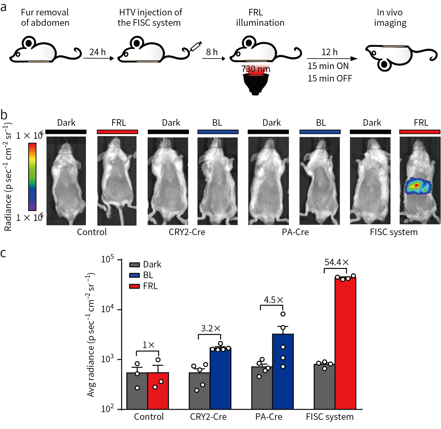 接下来对FISC系统能否在动物体内发挥作用进行探究。小鼠尾静脉高压注射3个质粒的FISC系统,8h后FRL照射小鼠腹腔,结果显示,FRL照射12h表现出高荧光素酶活性(图3a, b)。同时对不同的光诱导系统进行比较发现,携带FISC系统的小鼠,光照后荧光素酶活性明显高于其他系统图(图3b, c)。