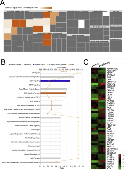 从差异蛋白的功能分类可以看出,这些蛋白参与的最主要的生物过程是核糖体生物发生和核蛋白复合体生物发生。金复康处理后,EGF信号通路被显著抑制,GP6信号通路被明显激活。其中EGF信号通路中mTOR、STAT3、STAT1和PRKCA蛋白表达下调(Fig.4-5)。