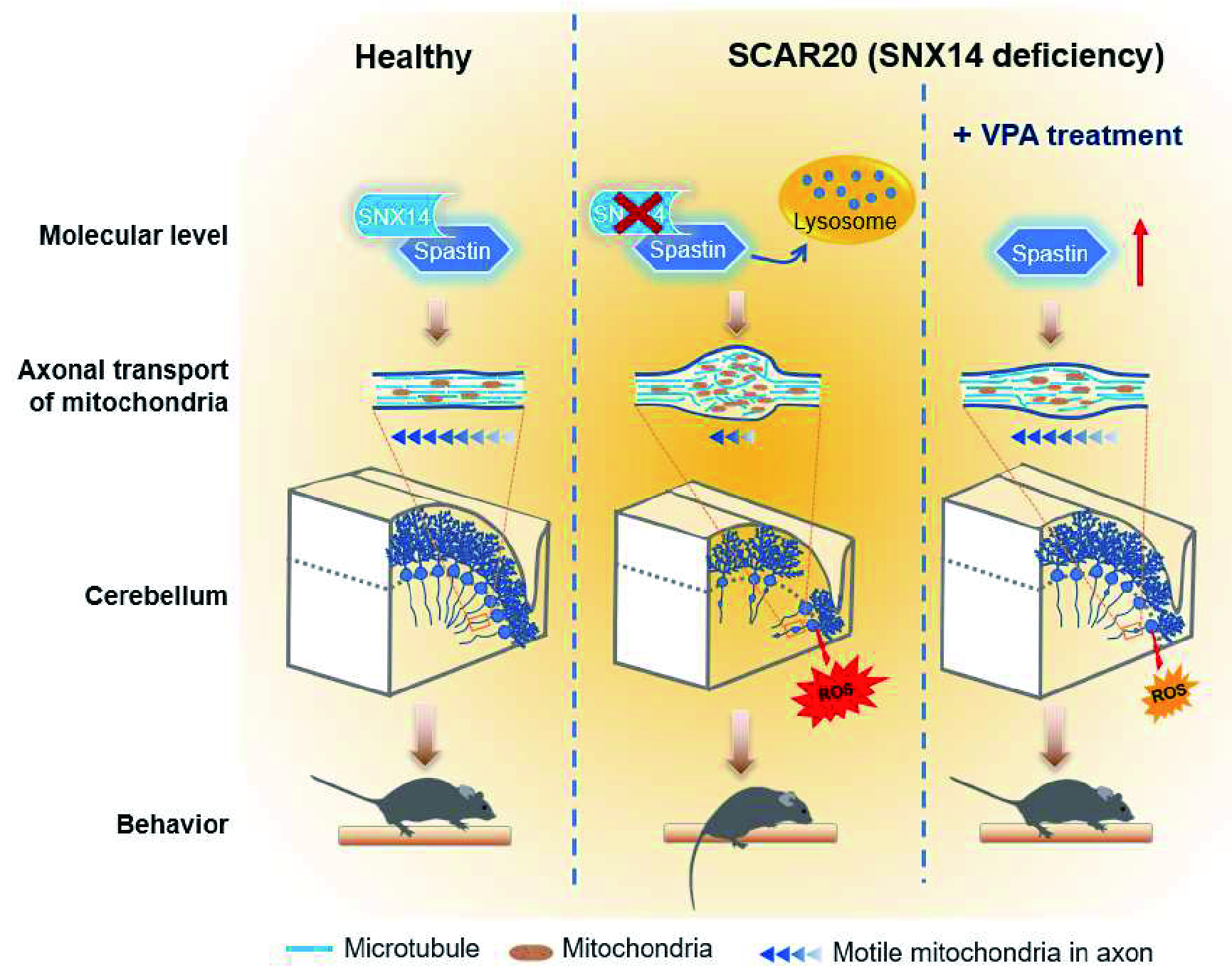 2020年,厦门大学医学院神经科学研究所王鑫教授团队在《国家科学评论》(National Science Review)上发表题为“SNX14 deficiency-induced defective axonal mitochondrial transport in Purkinje cells underlies cerebellar ataxia and can be reversed by valproate”的研究成果[3]。该研究首次从轴突线粒体运输这一全新视角揭示了一类遗传性共济失调(spinocerebellar ataxia, autosomal recessive 20, SCAR20)的发病机制,并发现抗癫痫药--丙戊酸大幅度减缓模型小鼠的疾病进程,具有较强的转化应用价值,有望为共济失调提供新的治疗手段。