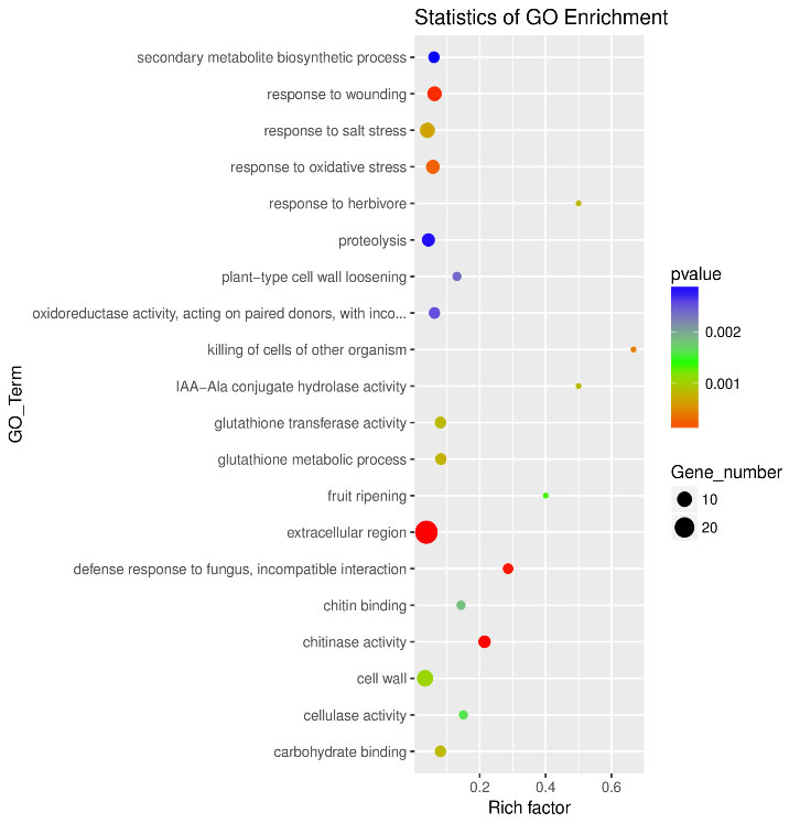 | 7.基因差异表达谱分析(聚类图,散点图,火山图); | 8. 差异表达基因的GO功能富集性分析,KEGG代谢通路富集性分析; |
