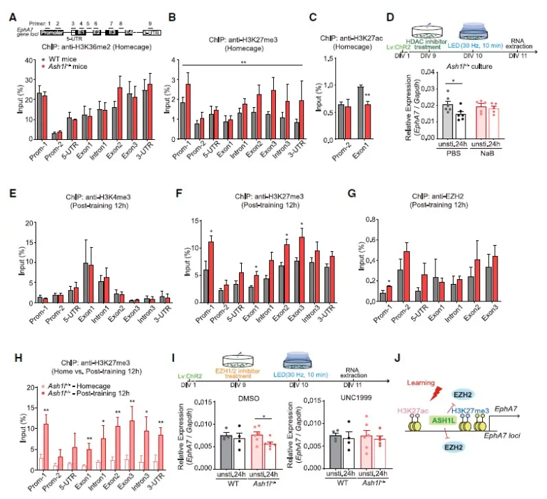 进一步,作者探究Ash1l是如何参与调控EphA7活动诱导表达,通过染色质免疫沉淀技术(ChIP)发现,Ash1l的直接靶点H3K36me2在WT和Ash1l+/-小鼠AUD EphA7基因位点附近没有明显差异,然而H3K27me3信号(组蛋白甲基转移酶复合体PRC2催化的抑制性标记物)在Ash1l+/-小鼠EphA7基因位点显著增加(图5A,B)。同时,Ash1l+/-小鼠中H3K27ac(一个活跃的增强标记。H3K27ac与H3K27me3共享一个位置,存在拮抗作用。)表达持续下降,用NaB(组蛋白去乙酰化酶抑制剂)预处理培养的神经元发现,刺激Ash1l+/-神经元后H3K27ac升高,EphA7表达恢复(图5C,D)。同样地,行为学结果显示,Ash1l+/-小鼠中H3K27me3、EZH2(PRC2复合体的一个重要的催化酶)表达水平显著增加(图5E-G)。通过UNC1999(EZH1/2抑制剂)对培养的神经元进行预处理,发现Ash1l+/-激活的神经元中EphA7表达受到抑制的现象得到改善(图5I)。上述结果提示了,Ash1l在活性依赖的PRC2介导的转录抑制累积中发挥拮抗作用,从而允许EphA7在激活的神经元中表达。