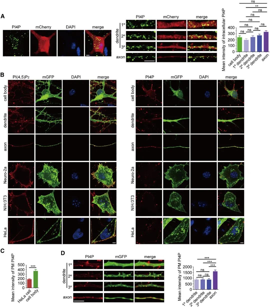 首先,为了明确磷脂酰肌醇4-磷酸(Phosphatidylinositol 4-phosphate, PI4P)在神经元中的亚细胞分布,作者借助免疫荧光技术发现,海马神经元细胞膜中PI4P信号强度明显高于Neuro-2a(小鼠脑神经瘤细胞)、NIH/3T3(小鼠成纤维细胞)和 HeLa(上皮细胞)。定量分析发现,PI4P在轴突胞膜中比树突更丰富(图1)。