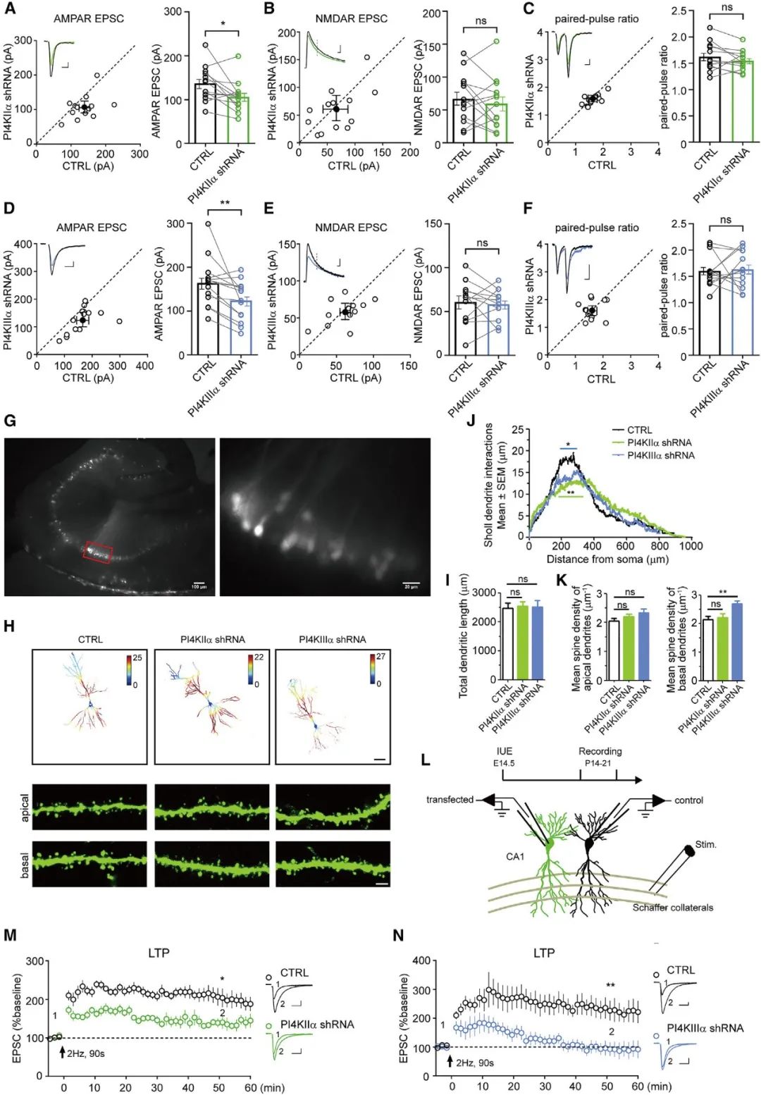 为了研究沉默PI4KIIa或PI4KIIIa是否会影响突触可塑性,研究人员首先在E14.5的小鼠胚胎中侧脑室注射PI4KIIa或PI4KIIIa的shRNA质粒,然后在P14-21之间制备了小鼠的急性脑切片并进行电生理记录。LTP分析显示,沉默PI4KIIIa不仅显著降低了LTP的幅度(magnitude),并且破坏了CA1神经元中LTP的维持(图5M,N)。这些数据提示了PI4KIIIa依赖的PI4P合成对于LTP期间的树突棘的结构和功能可塑性至关重要。