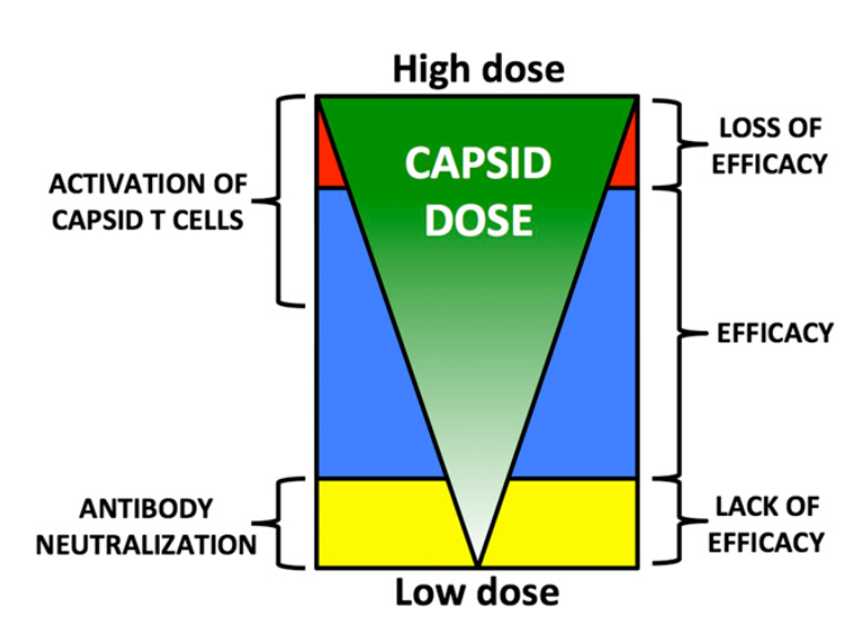在一些研究中,针对rAAV衣壳或转基因产物的免疫反应已被确定为导致表达减少或完全丧失的原因。低剂量的rAAV有可能被anti-AAV抗体,甚至低滴度的中和抗体中和,从而导致效果不明显,然而,过高剂量的rAAV,随着衣壳剂量的增加,使得对衣壳特异性T细胞活化,激活免疫介导从而清除转导的靶细胞,导致治疗效果丧失,甚至由于严重的免疫反应导致实验对象的损失(Mingozzi et al., 2013)。