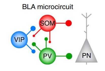 图1 杏仁核中中间神经元形成的微环路,VIP+INs和另外两种中间神经元形成了两个“非门”的结构调控主要神经元