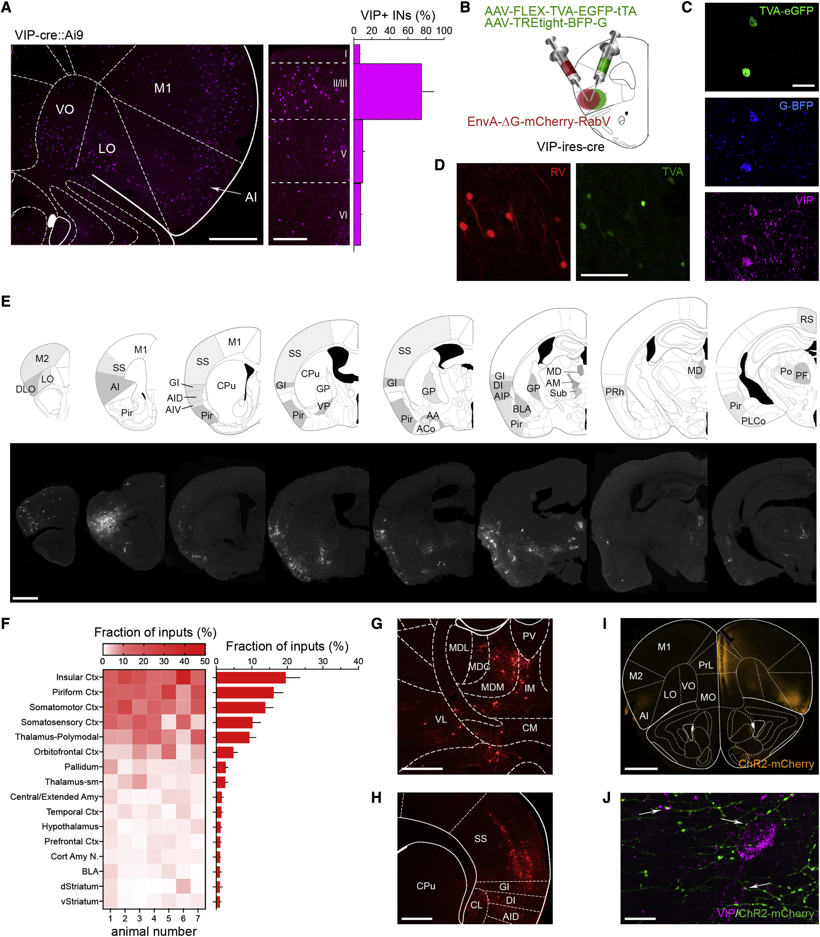 图2 VIP+INs在岛叶皮层的分布和接受的上游输入