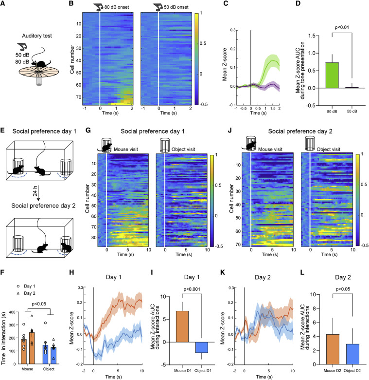 接下来作者继续分析VIP+INs在听觉测试下的活动规律。在听觉测试范式下,动物会分别接受两种频率相同但是响度不同的声音刺激(图4A)。分析结果表明更高分贝的声音刺激更能够出触发VIP+INs的反应(图 4B-4D)。