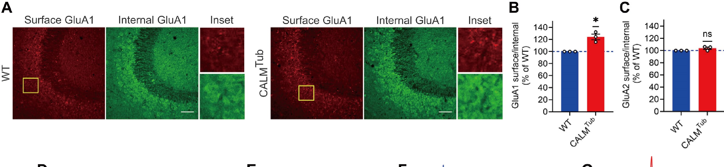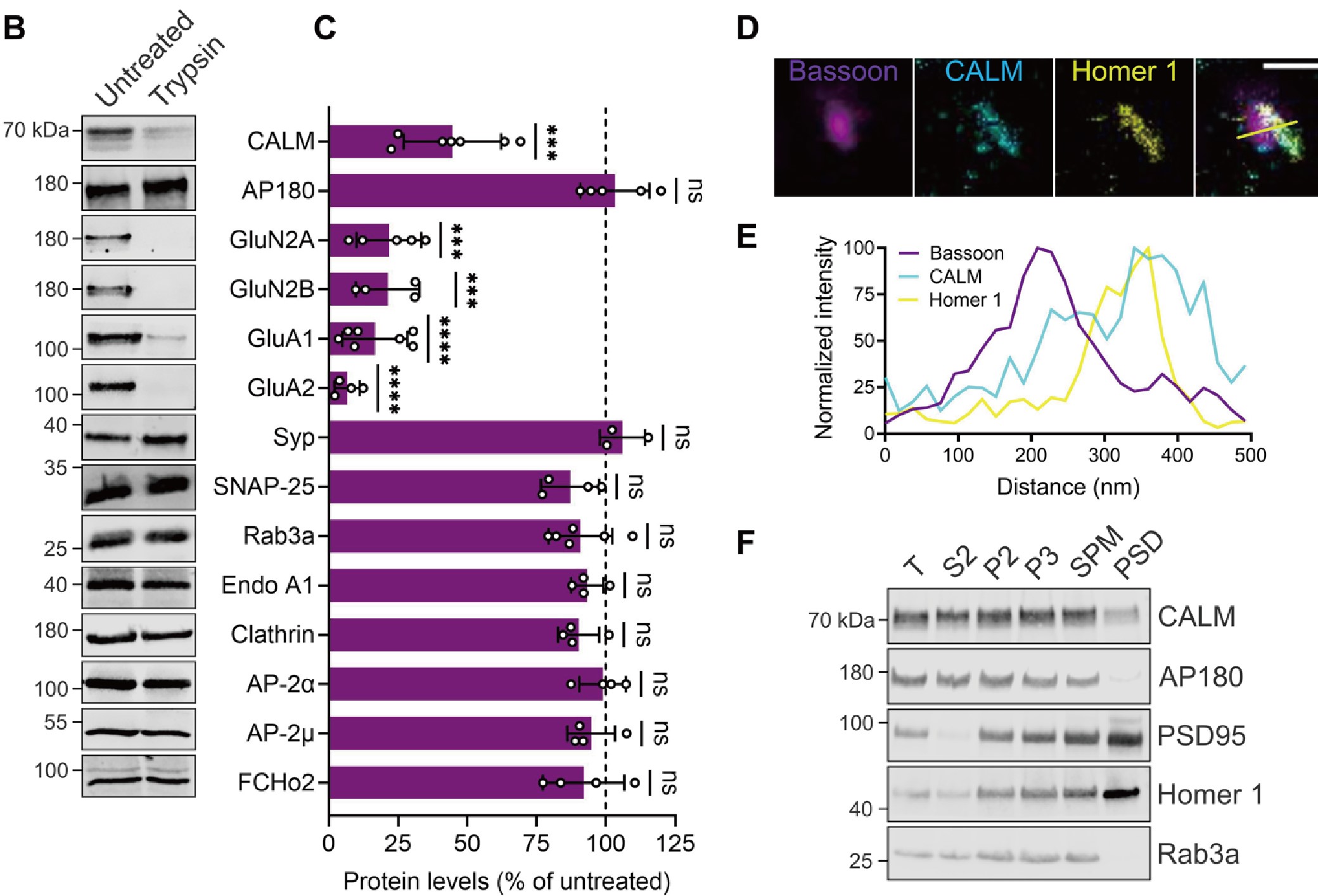 首先,研究者分离小鼠的突触小体进行胰蛋白消化筛选,以识别突触后选择性富集的内吞蛋白。结果发现,CALM(网格蛋白装配淋巴样骨髓白血病蛋白) 作为一种内吞蛋白,选择性富集于AMPAR内吞发生的突触后区域。